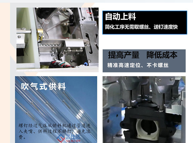 該鎖付系統(tǒng)可等同為全自動(dòng)鎖螺絲流水線,通過(guò)四個(gè)工作站的作業(yè),將百葉窗扇葉通過(guò)螺絲緊固在框架內(nèi)的指定位置,螺絲采用自主研發(fā)吹氣式自動(dòng)送釘機(jī),直接輸送至鎖付機(jī)構(gòu);扇葉通過(guò)專(zhuān)用治具與框架定位,需手動(dòng)放置;鎖付系統(tǒng)采用水平雙方向同時(shí)作業(yè),配置4把電批位于兩側(cè),一次擰好4顆螺絲;移動(dòng)式作業(yè)臺(tái)根據(jù)程序設(shè)定,逐點(diǎn)向前推進(jìn)并自動(dòng)擰螺絲。